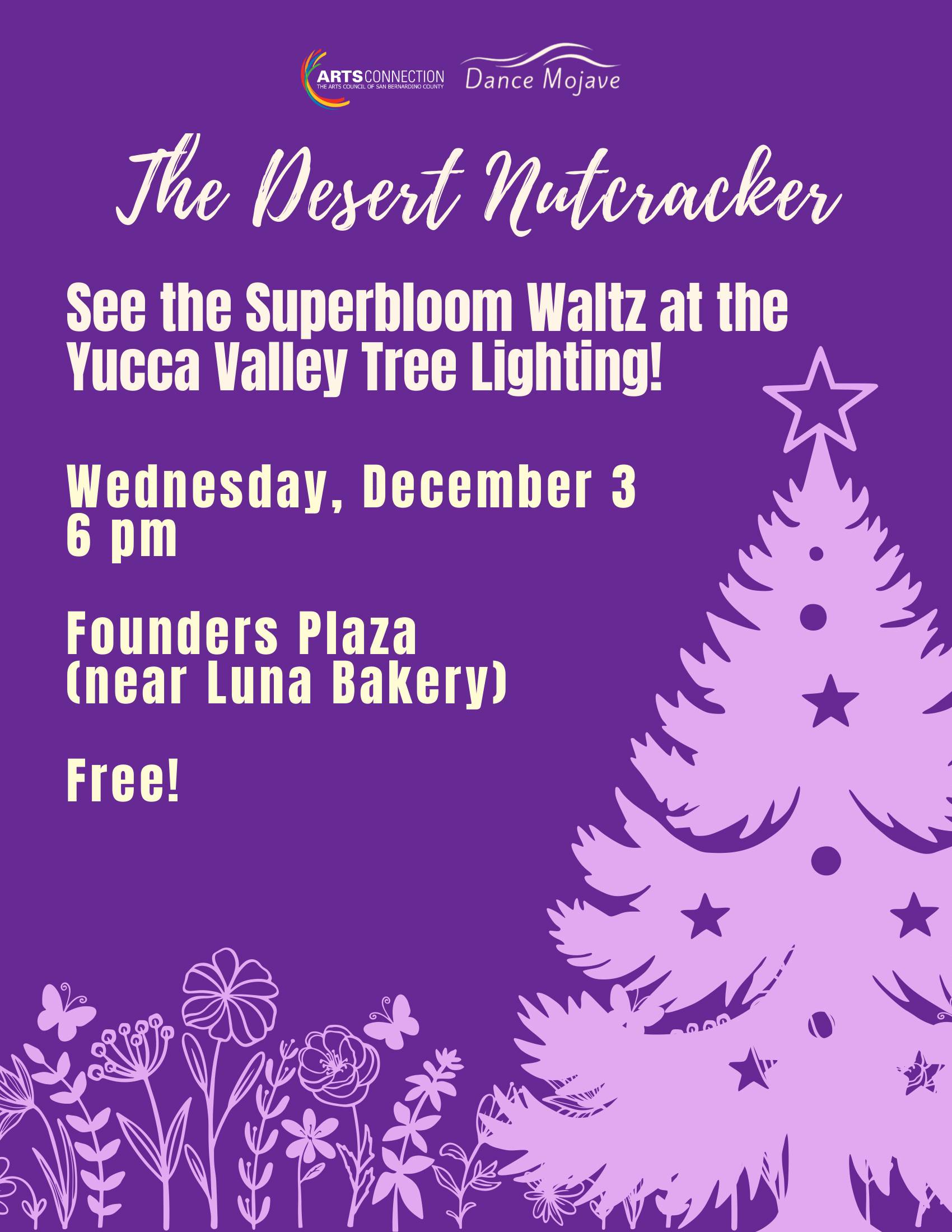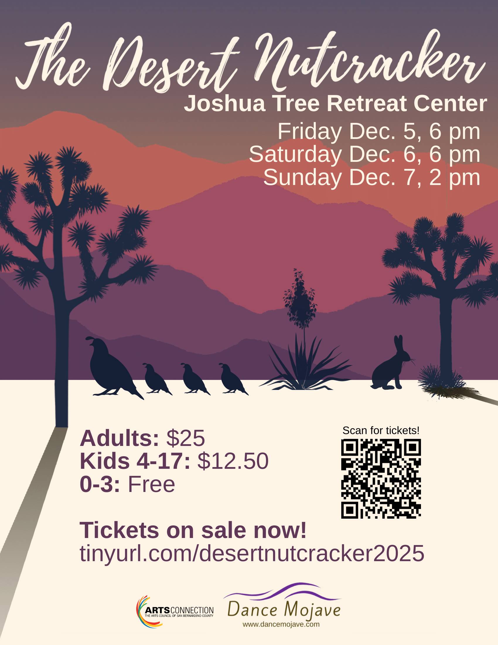 Arts Connection is highlighting Microgrant recipients Melissa Daniels and Jenn Henry of the Dance Mojave Performance Collective, who are presenting this year’s production of The Desert Nutcracker. Their reimagined take on the holiday classic swaps traditional winter themes for the plants and wildlife of the Mojave, blending classical ballet with contemporary movement to tell a story rooted in the desert. This year’s show at the Joshua Tree Retreat Center builds on last year’s performance with new choreography and additional characters. Dance Mojave will also share a preview of their Superbloom Waltz at the Yucca Valley Tree Lighting on December 3.