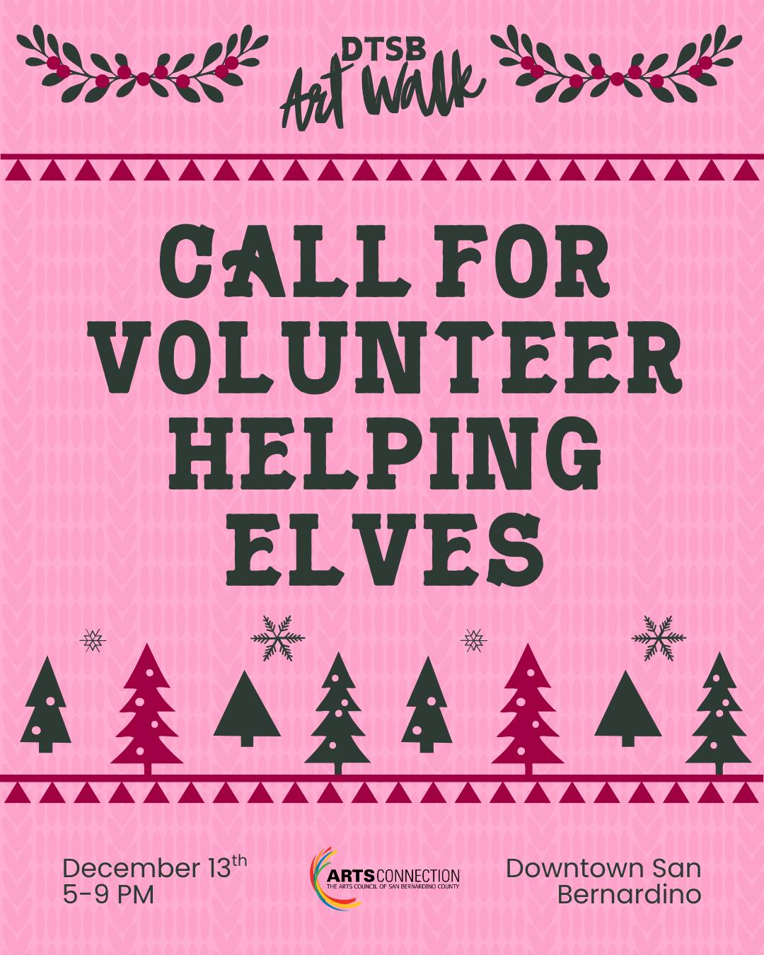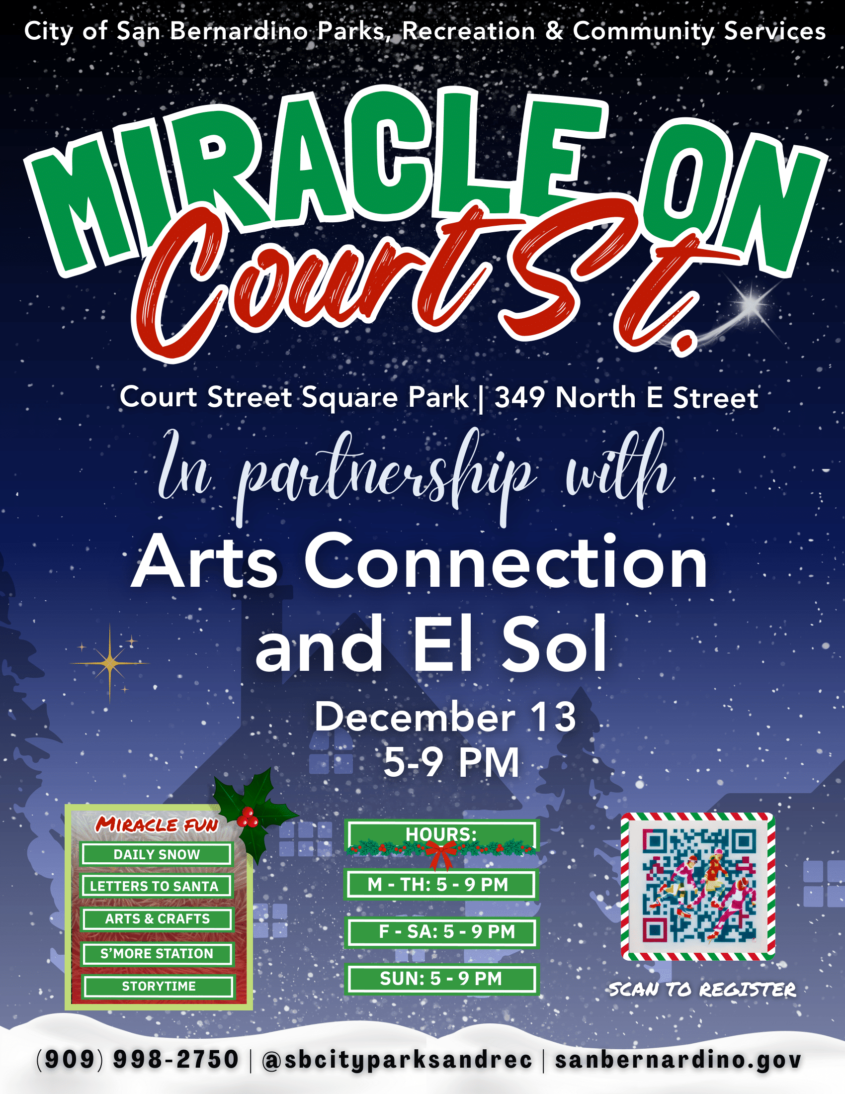 Arts Connection is looking for volunteers to support Miracle on Court Street and the DTSB Art Walk on Saturday, December 13th from 5pm to 9pm in downtown San Bernardino. Volunteers help keep the space welcoming, organized, and running smoothly for families, artists, and visitors throughout the evening.