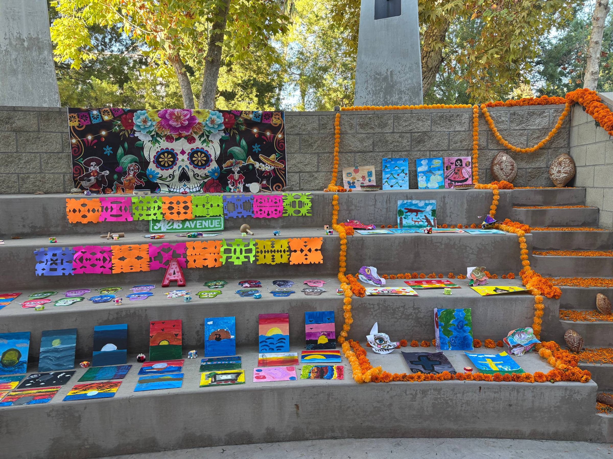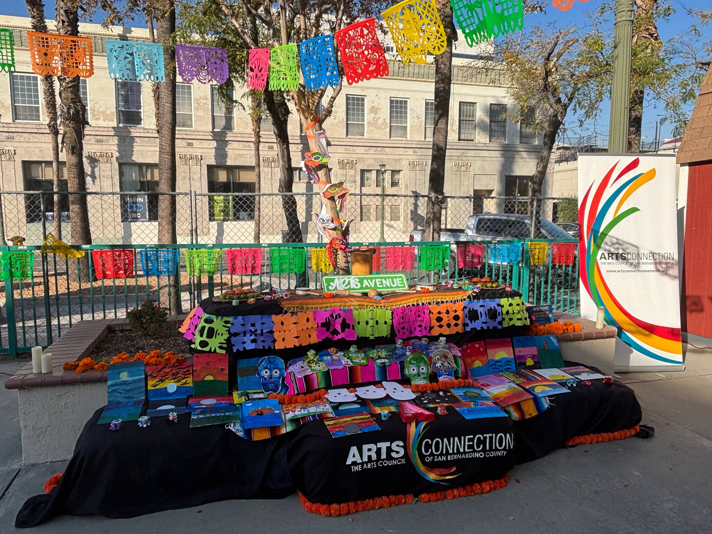 Arts Connection spent last month honoring Día de los Muertos with partners KVCR, SB Parks and Recreation, and the San Bernardino County Museum. It was a space to remember our ancestors, celebrate loved ones, and come together as a community. This year we collaborated on two altars with SB Parks and Rec and the County Museum, featuring artwork created by students in our Arts Avenue after school programs across San Bernardino City Unified. Our instructors introduced students to the meaning behind Día de los Muertos, then guided them through projects that became part of each altar. Davidson Elementary created alebrije puppets, Kendall Elementary made sugar skull masks, Lincoln Elementary designed papel picado, and Golden Valley Middle School contributed candles.