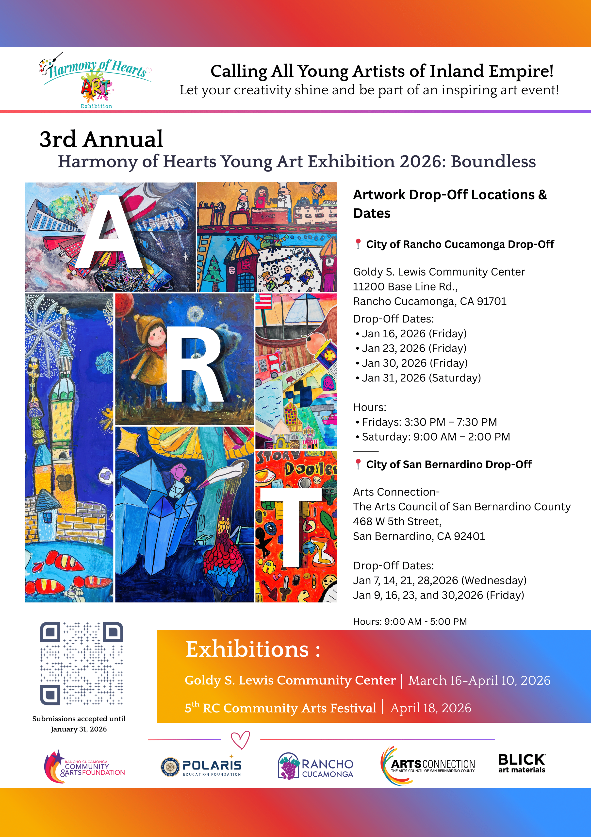 Now in its third year, the Harmony of Hearts Young Art Exhibition invites K–12 student artists from across San Bernardino County to submit artwork that imagines a world without limits—of creativity, culture, dreams, and possibility. the exhibition theme, "Boundless", aims to encourage young artists to reflect on how art can cross borders, connect communities, and open new pathways for the future.