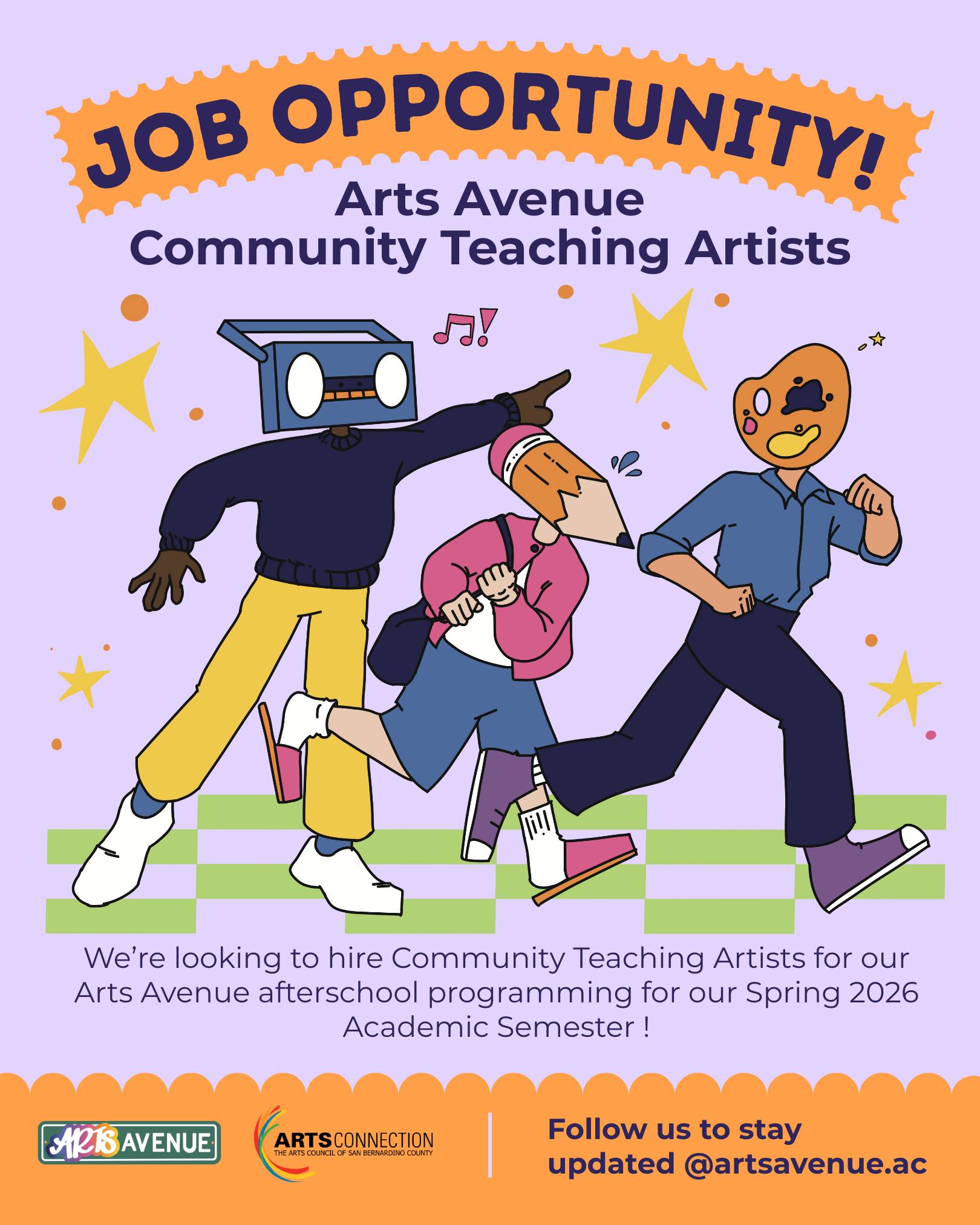 We are seeking passionate and experienced Community Teaching Artists to join our team for the Spring 2026 Arts Avenue afterschool semester. Teaching Artists will lead arts-based classes for elementary and middle school students, creating spaces where young people can build confidence, develop new skills, and explore creative problem solving. This role includes designing and implementing lesson plans that align with VAPA standards, support diverse learning styles, and help students create meaningful work rooted in their own voices and experiences. This is an ongoing recruitment and applications will be reviewed as they are submitted.