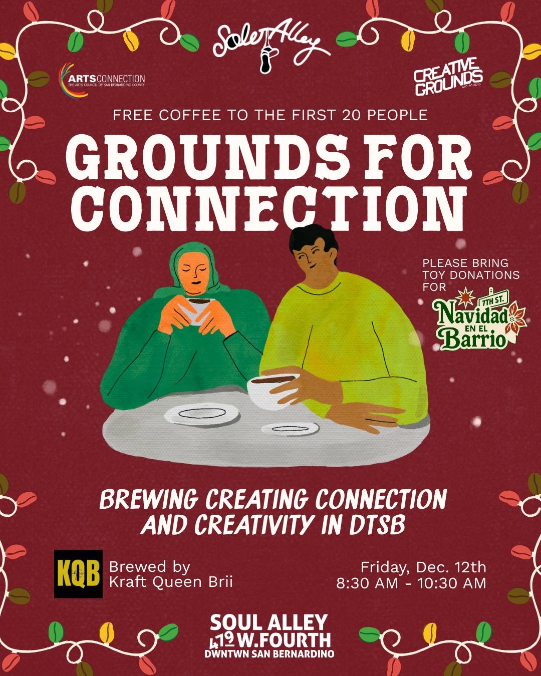 Join us at Sole Alley for this month’s Grounds for Connection, a community gathering co hosted with Creative Grounds. If you’re a local artist, culture bearer, small business owner, or part of a community organization, this space is for you! Pull up to connect, share ideas, and help strengthen the creative network shaping the future of Downtown San Bernardino.