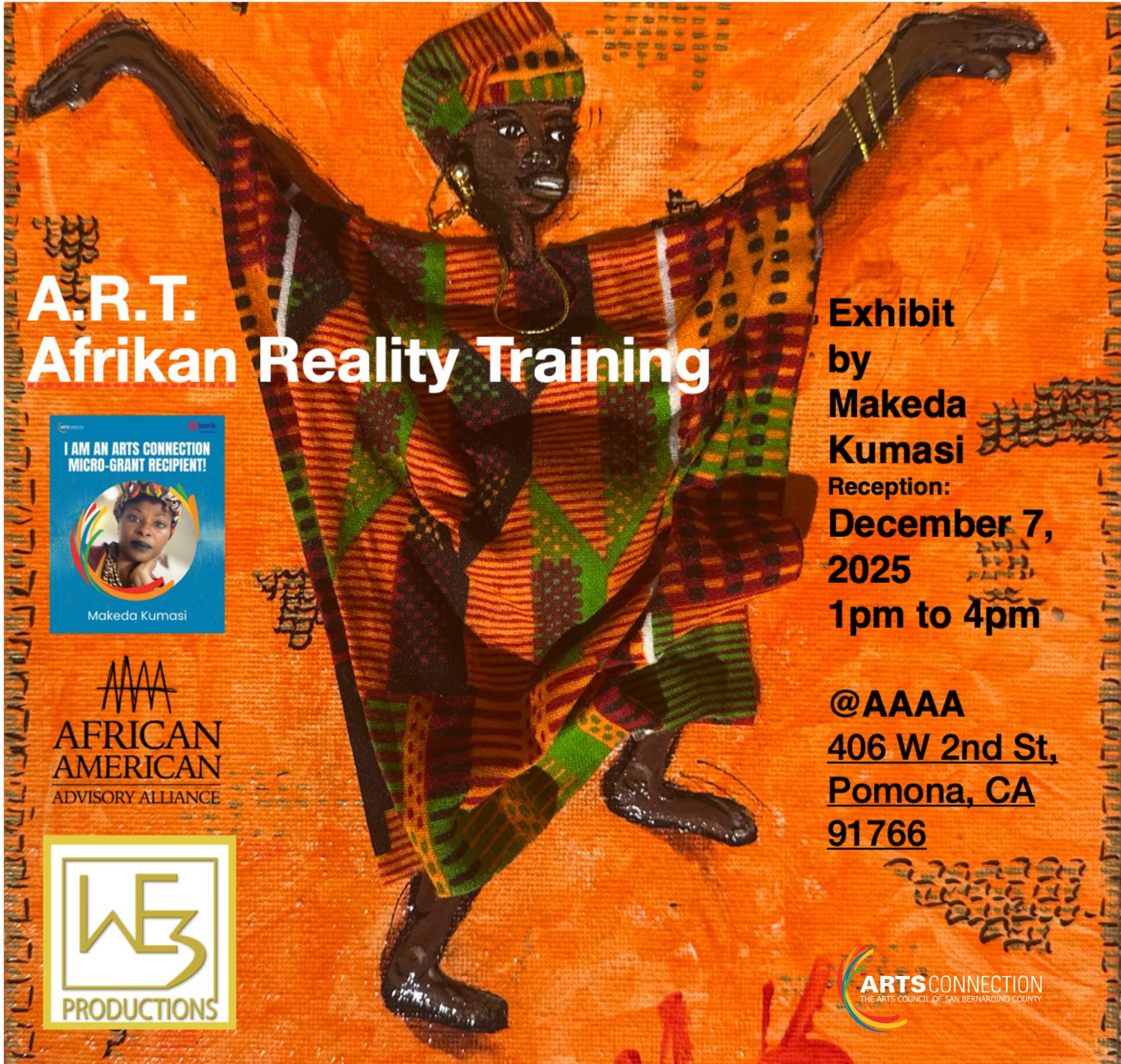 Arts Connection is highlighting Microgrant recipient Makeda Kumasi, whose exhibit A.R.T: Afrikan Reality Training is now on view at the African American Advisory Alliance Community Center. The show brings together paintings and photographs created over the past two decades, including work developed through Makeda’s study of African-centric theory, West African culture, and Kemetic language. Featured pieces include “Betrayal,” previously shown at Claflin University; “Women Who Weave Womb Worlds for the Walking Woke,” displayed in a virtual museum curated by Sharon Lee Minor, PhD; and “Nzinga Ratibisha Horemakhet,” a new mixed-media watercolor on papyrus finished with sand from the Nile. The exhibit is open through December, with a reception on Sunday, December 7th, supported by the AAAA Community Center.
