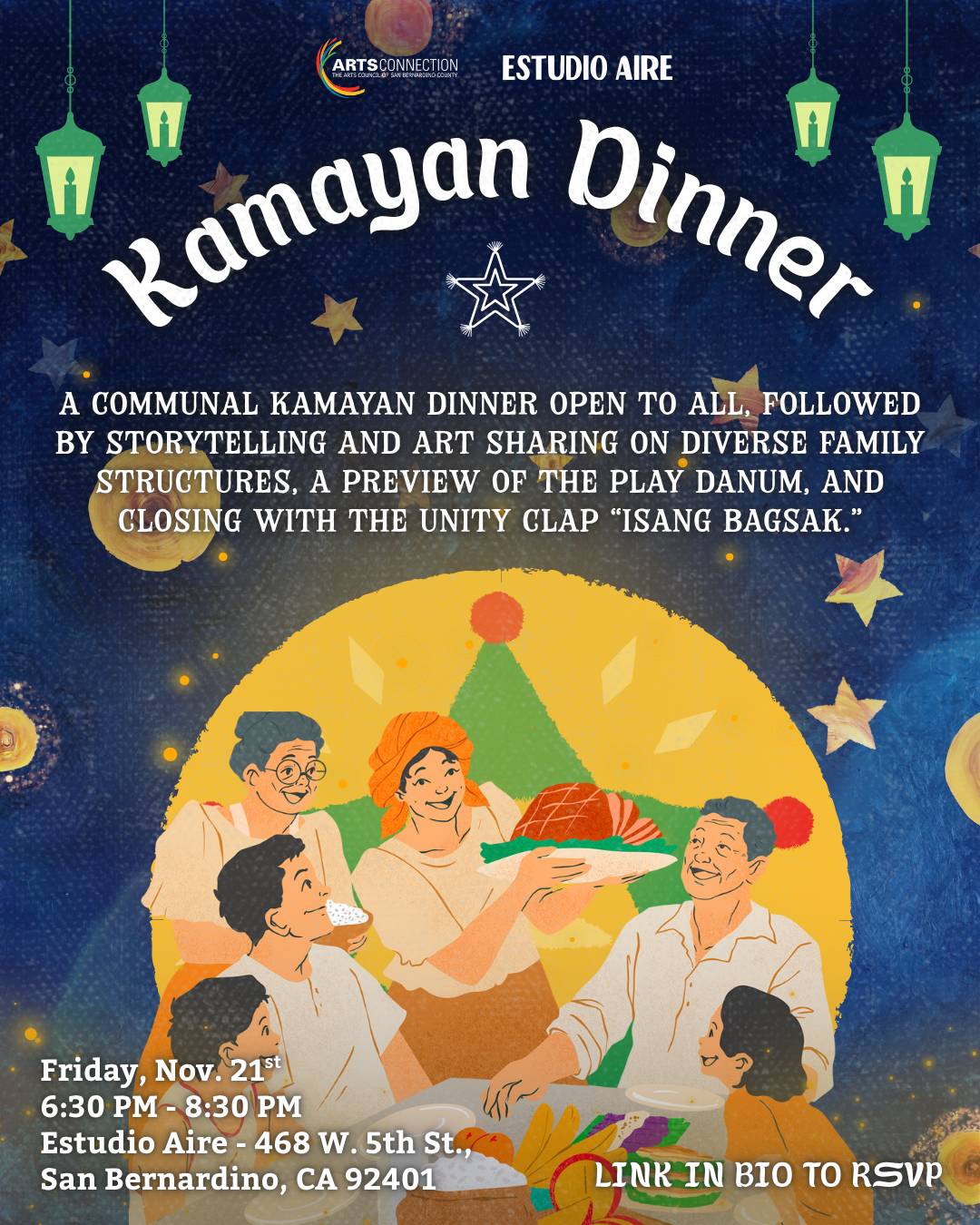 Estudio Aire invites the community to gather for a Kamayan Dinner — a traditional Filipino feast served on banana leaves — celebrating connection, storytelling, and shared creativity. Families who participated in the Happenings and community members alike are welcome to enjoy this communal meal, followed by an open sharing circle reflecting on the past, present, and future of diverse family structures. Participants will have the chance to showcase artwork and insights from their experiences, and the evening will feature a special creative update on the new play Danum, including its first draft and shadow puppet designs. The night concludes in solidarity with the powerful unity clap, “Isang Bagsak.”