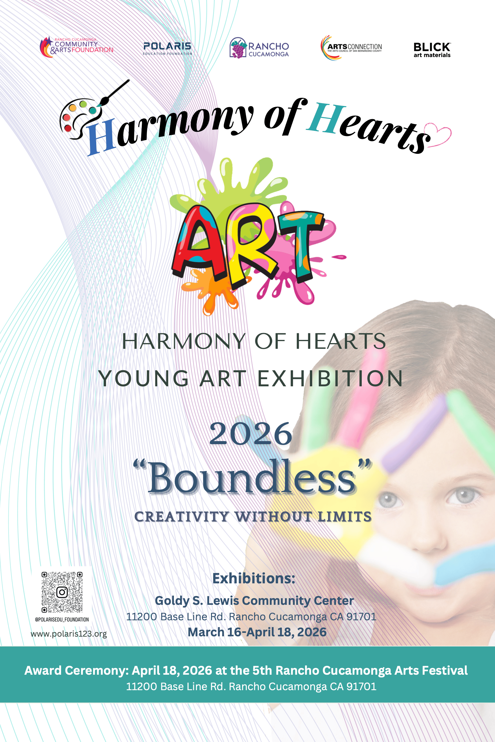 The exhibition will culminate on Saturday, April 18, 2026, from 10:00 AM to 3:00 PM, as part of the 5th Rancho Cucamonga Arts Festival. During this time, visitors can experience the full showcase alongside live stage performances, arts-related booths, and hands-on activities for the community. The award ceremony will also take place during this time, recognizing outstanding young artists and bringing the exhibition to a meaningful close.