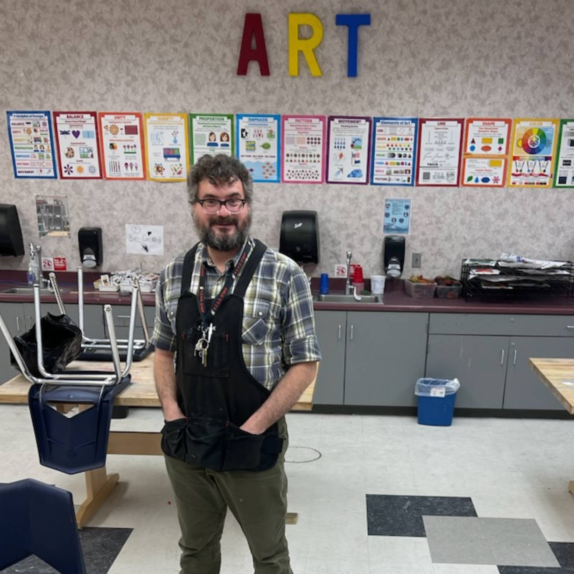 Sam Tomasello is an artist, printmaker, and arts teacher at Mesa Linda Middle School in Victorville. A U.S. Army veteran of nearly ten years, he once painted nose art on helicopters in Iraq and Afghanistan. His art explores themes of PTSD, depression, and healing. Tomasello studied studio art and art history in California and now finds purpose guiding students through creativity, craftsmanship, and self-expression.